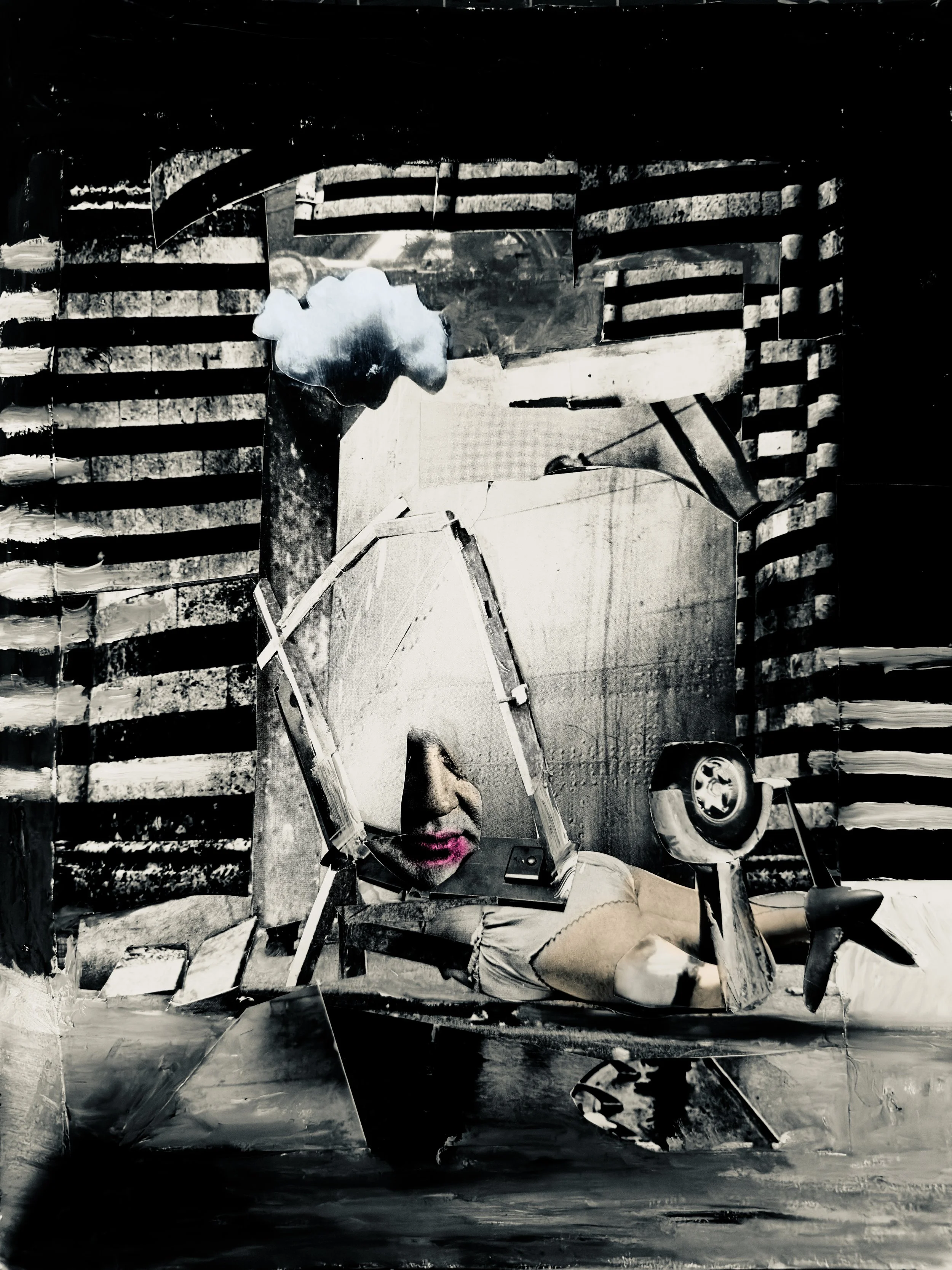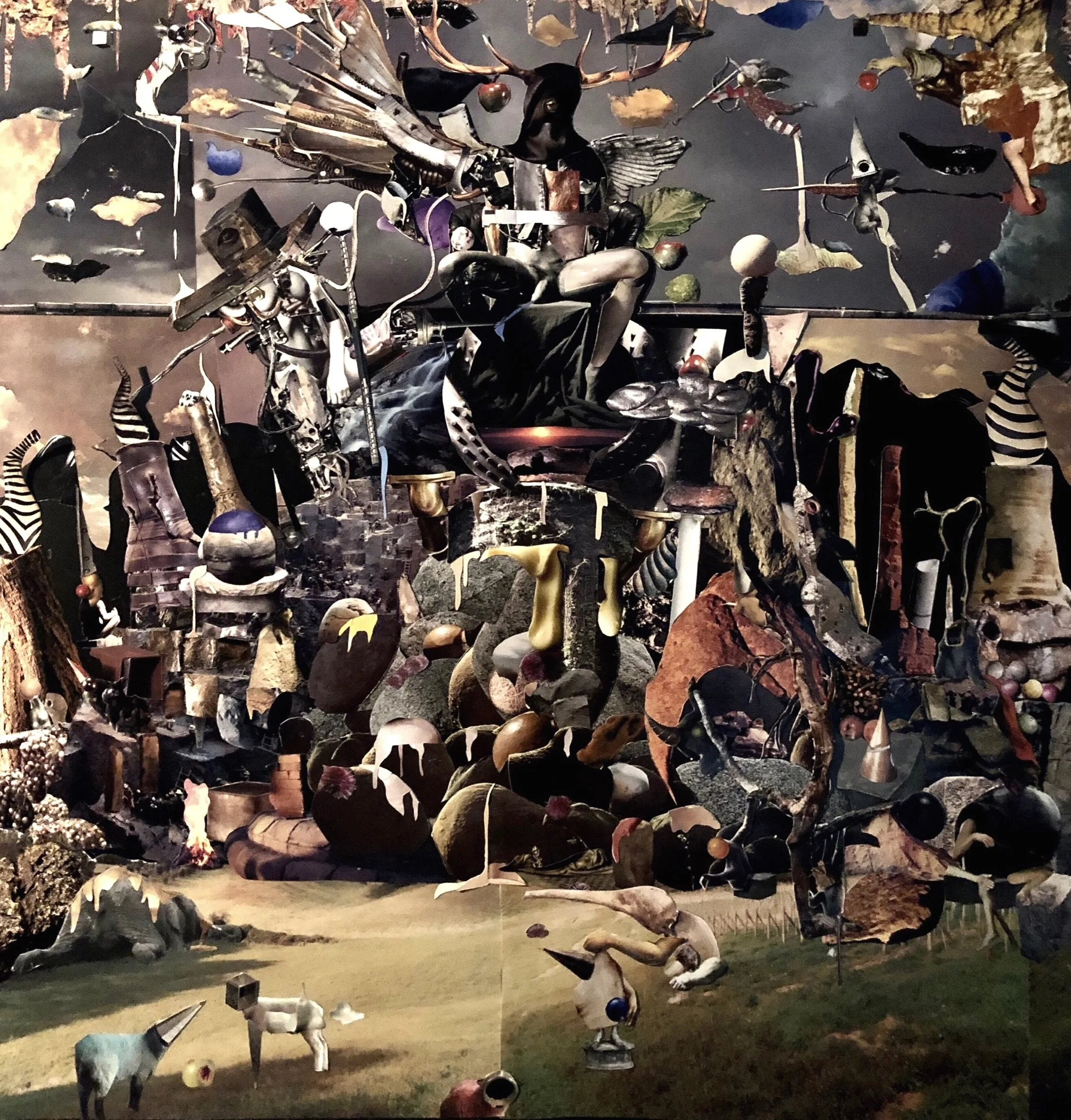 Known primarily for working in the medium of collage, Knudson builds his work using myriad and eclectic imagery. This painstaking process involves sourcing, selecting, cutting, and arranging elements. He elaborates, “I primarily identify as a collage artist, though I often incorporate oil paint into my work. Collage excites me because it unlocks creative possibilities I might not explore if I were solely focused on painting. Each step in the process reveals a new formation, creating a spiritual journey and a personal escape.”