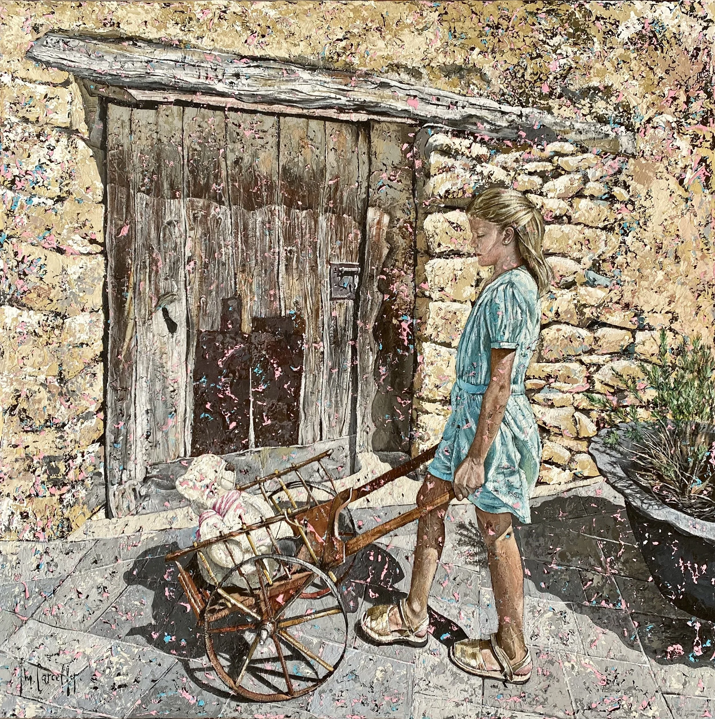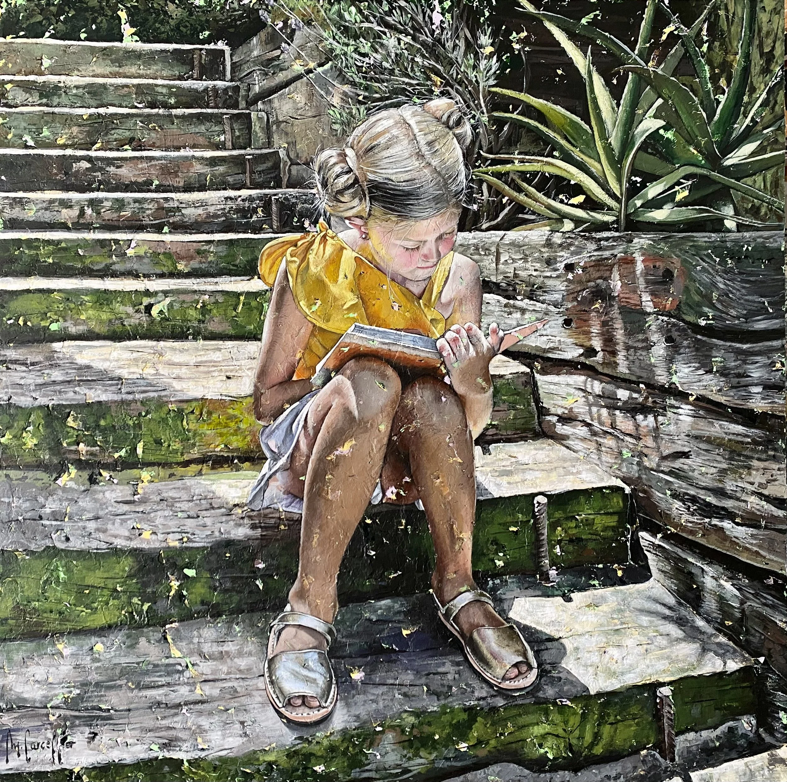 Carceller has created a unique visual vocabulary, combining abstraction and figuration in warm light-filled paintings characterised by a dynamic textured surface. When describing her technique, the artist explains, “Although the intense work of drawing and highlighting the colours and shadows allows me to achieve two-dimensionality, a fine rain of abstraction runs through my paintings, soaking behind it the everyday figuration in an elegant pictorial symbiosis.” Carceller skilfully combines hyperrealism and painterly expressionism in artworks that represent poignant moments in time. In Immersed in fantastic worlds a child is reading on a step outside; the warmth of the sun is palpable. In the same direction depicts two children animatedly running down a treelined street and into the future. Carceller captures the nostalgia, tenderness and beauty of everyday moments.