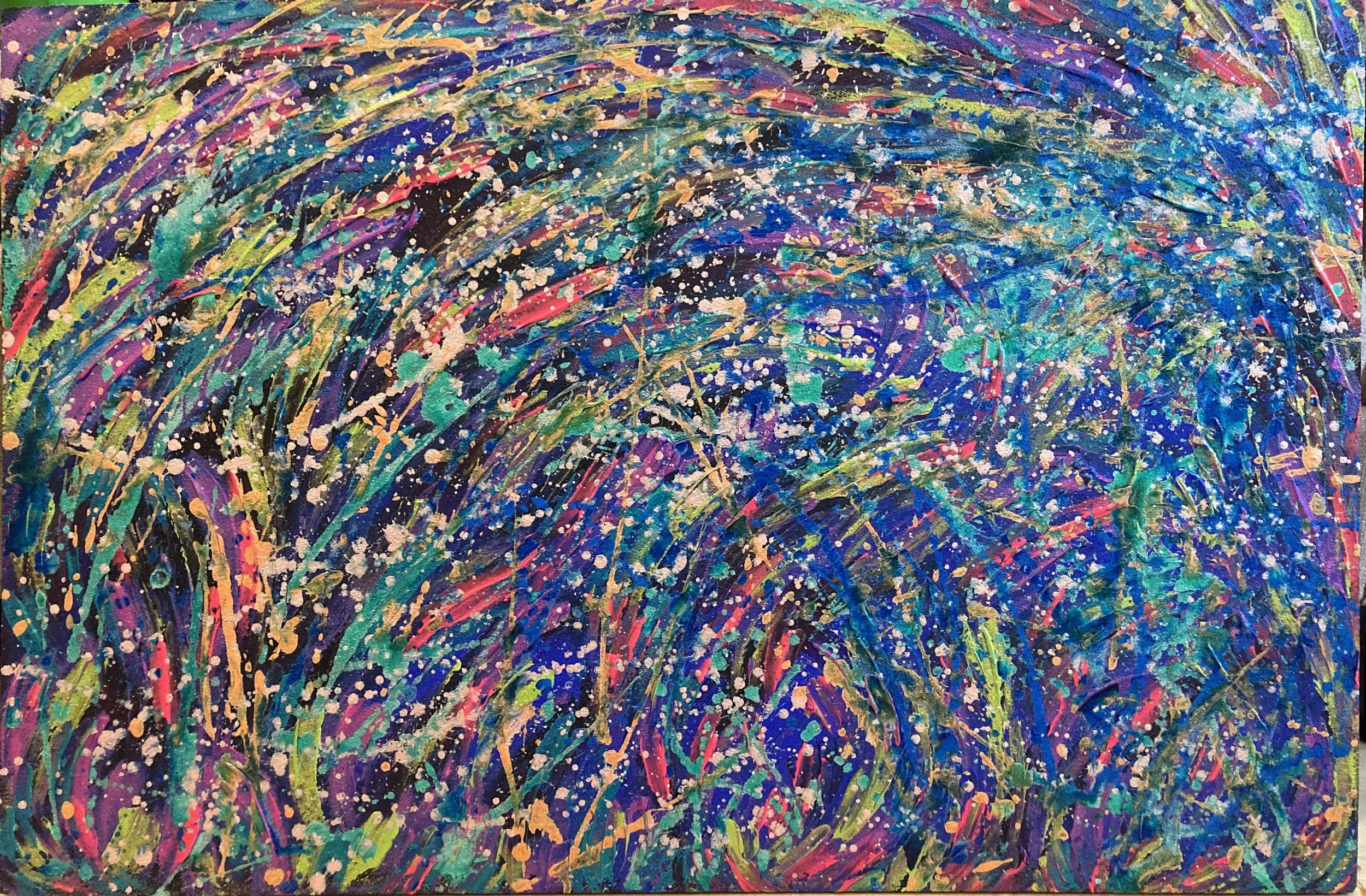 Karaya began painting in 2021 following a series of very significant and devastating life events. The artist describes her desire to paint as a compulsion, rather than a conscious decision, “My creative energy just erupted from within.” She explains. Indeed, Kaya’s flowing energy is powerfully present within every one of her paintings. Her work is instantly recognisable for its vivid colour palette and dynamic mark-making. Works such as Home, Elevate, Root and First Born, document the artist’s emotion and energy across various surfaces, from tree roots and cork sheets to traditional canvas. Inspired by her Reiki practice, Karaya’s process is deeply intuitive and spontaneous.